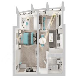 Умная планировка: Несмотря на 37 м², здесь есть продуманная гардеробная, что решает главную проблему малометражек — нехватку мест хранения.