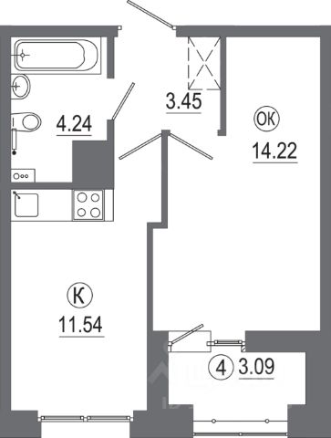 Общая площадь квартиры 44,14 квадратных метра: