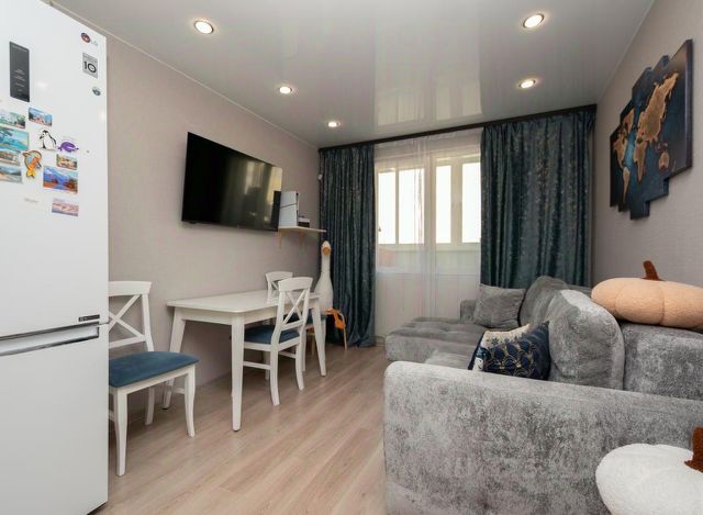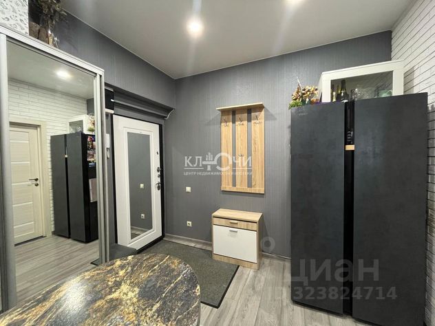 Потолки натяжные по периметру всей квартиры, установлены светильники. входная зеркальная дверь.
