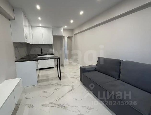 Жилые помещения занимают 46.5 квадратных метров, кухня размером 18 кв м, каменная столешница, профессиональная вытяжка, электрическая плита, холодильник side by side, посудомоечная машина все остается.