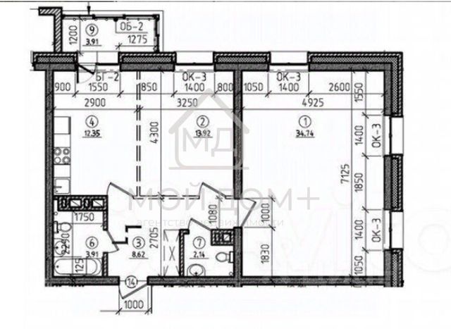 в комнате 34,74 м с тремя окнами - сделать две детские или две спальни.