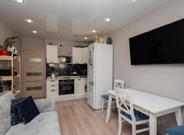 Потолки натяжные по периметру всей квартиры, установлены светильники. входная зеркальная дверь.