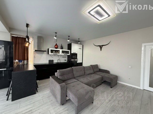 Жилые помещения занимают 46.5 квадратных метров, кухня размером 18 кв м, каменная столешница, профессиональная вытяжка, электрическая плита, холодильник side by side, посудомоечная машина все остается.