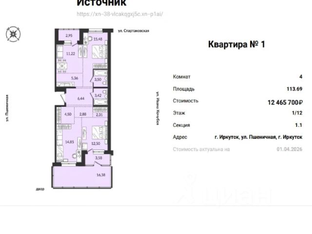 Продаётся 4-комнатная квартира в сданном доме (1-й Ленинский квартал, 1 (Дом 1 Секция 1)), срок сдачи: IV-кв. 2022, общей площадью 65.5 кв.м., на 3 этаже. Первый Ленинский квартал - новый перспективный квартал, масштабы которого поражают. В нем предусмотрено все: расположение, уютный благоустроенный и, что немаловажно, безопасный двор с видеонаблюдением, умные домофоны, энергоэффективное освещение. Будет установлена парковка для электромобилей с возможностью подзарядки, стойки для велосипедов. В квартирах умные счетчики, окна с витражным остеклением. Все наше огромное пространство мы поделили на зоны. Акцент сделан на озеленении, ведь приятно отдохнуть на скамейках в окружении деревьев и кустарников. Для ребятишек предусмотрена современная детская спортивно-игровая площадка. Мы постарались подойти к этому вопросу нестандартно и установить здесь не классический детский городок, какими сегодня заполнены городские дворы, а нечто более инновационное. Чего будут стоить только качели в виде карусели с сидениями в форме прозрачных капсул! Не забыли мы и о молодежи. Большая спортивная площадка, оборудованная всем необходимым снаряжением, позволит каждому выбрать тренажер по душе, а точнее по силам. А еще на всех площадках предусмотрена установка малых архитектурных форм. Ленинский округ - один из лучших районов Иркутска. За последние 10 лет здесь построены восемь детских садов, плавательный бассейн "Спартак", современная школа 69 на 1250 мест, строится поликлиника и физкультурно-оздоровительный центр, завершены проекты трех пристроев к действующим школам, проектируется еще одно образовательное учреждение на 1350 мест. В планах и возведение крытого футбольного манежа.В непосредственной близости от нашего квартала находятся три школы, три детских сада. Есть также и частные дошкольные учреждения. И мы не говорим уже о наличие торговых объектов, индустрии красоты, служб бытовых услуг. Их количества вам будет достаточно, чтобы чувствовать себя абсолютно счастливым человеком. Конечно, мы не забываем о здоровье. 10-15 минут прогулочным шагом, и вы окажетесь на территории медицинского учреждения. Здесь находится филиал взрослой поликлиники и детская поликлиника 8. Сразу за медицинским объектом -- роща "Молодежная", где всегда можно насладиться чистым свежим воздухом. Для тех, кто занимается спортом, также есть отличное решение. ФОК "Локомотив" всегда к вашим услугам. Огромный стадион, различные секции прекрасно разбавят ваш досуг. Остановка общественного транспорта: "Норильская". Транспортные маршруты: автобусы 10к, 13, 14, 14б, 24, 25, 30, 33, 36, 37, 39, 42, 46, 54, 60, 65, 372, 401