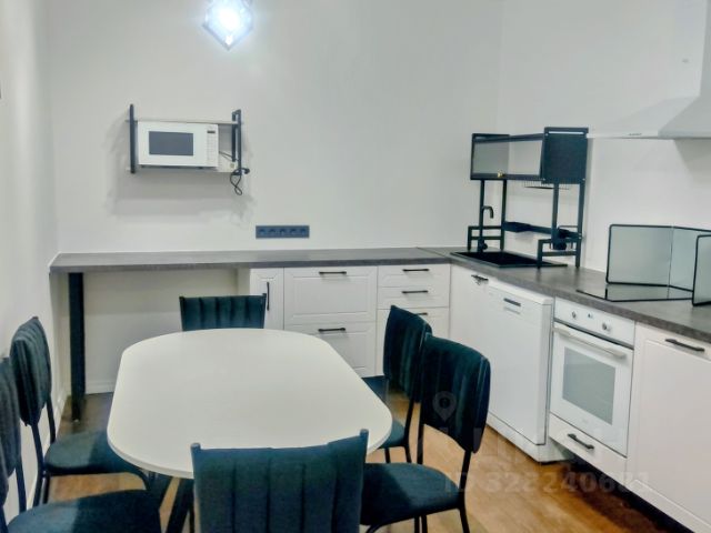 На первом этаже квартиры расположен стильный холл с встроенным гардеробом, который удобно организует пространство. Просторная кухня-гостиная, оформленная в современном стиле, оснащена кухонным гарнитуром от известной фабрики "Мария". В ней установлены высококачественная встроенная техника: индукционная плита Bosch, угольная вытяжка, духовой шкаф Gorenje, посудомоечная машина Ariston, холодильник Haier и раковина из искусственного камня Schock.