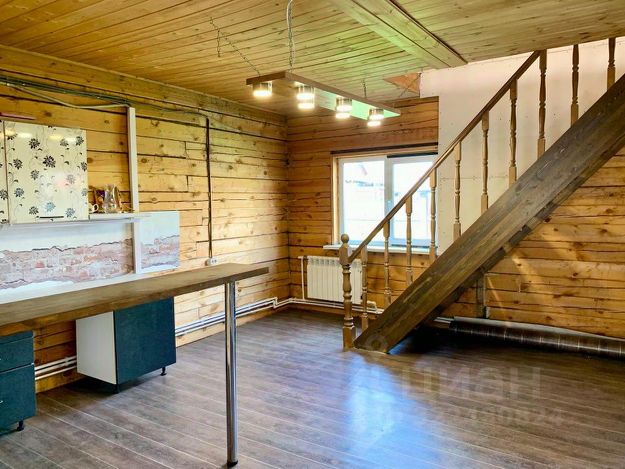 Отделка первого этажа: потолки - вагонка, натяжные потолки, пол в кухне и ванной - плитка керамогранит, в остальных комнатах - ковролин. Стены - брус.