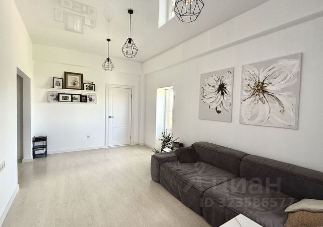 На первом этаже расположена просторная кухня, гостиная, прихожая, санузел, гардероб и балкон с панорамным остеклением, высота потолков 3,03 м. На втором этаже три спальни с ванной и санузлом, балкон и открытая терраса.