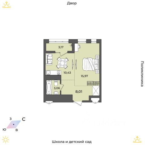 В поселке есть кафе и рестораны, рядом с домом - детская и взрослая поликлиники, неподалеку - кардиологический центр.