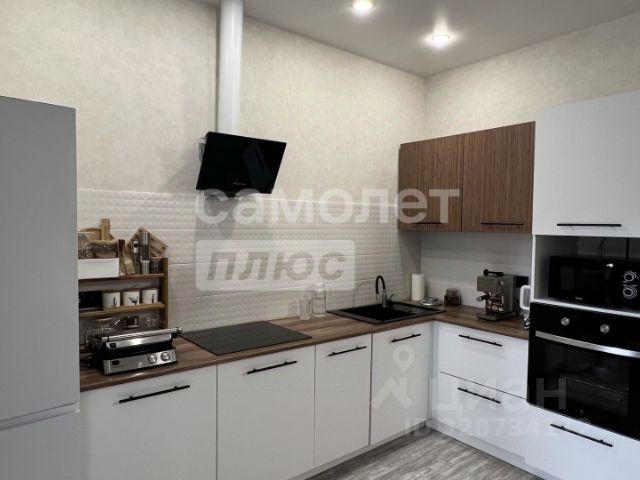 Жилые помещения занимают 46.5 квадратных метров, кухня размером 18 кв м, каменная столешница, профессиональная вытяжка, электрическая плита, холодильник side by side, посудомоечная машина все остается.