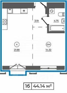 Общая площадь квартиры 44,14 квадратных метра: