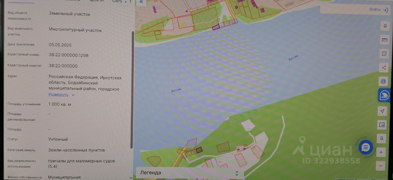 Земельный участок с кадастровым номером 38:22:000000:1298 площадь 1000 по адресу Российская Федерация, Иркутская область, Бодайбинский муниципальный район, городское поселение Бодайбинское, г. Бодайбо