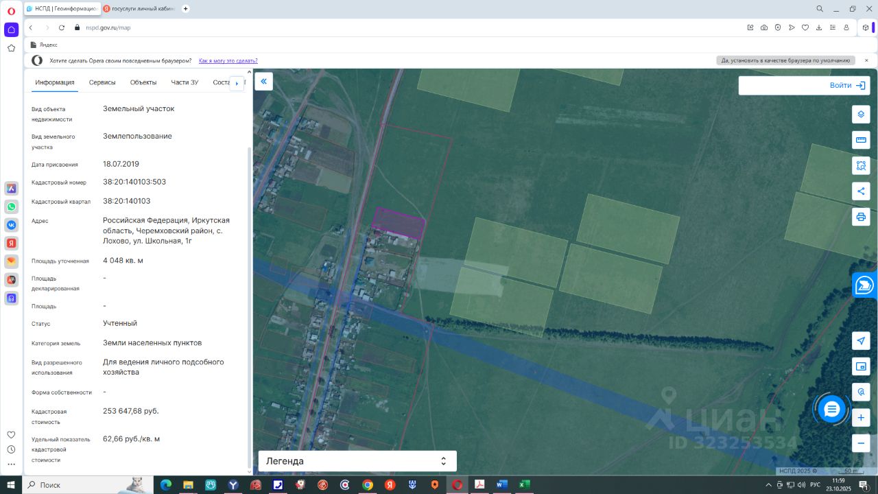 земельный участок из земель населенных пунктов, с кадастровым номером 38:20:140103:503, расположенный по адресу: Российская Федерация, Иркутская область, Черемховский район, с. Лохово, ул. Школьная, 1г, площадью 4048 кв.м, с видом разрешенного использования "приусадебный участок личного подсобного хозяйства".