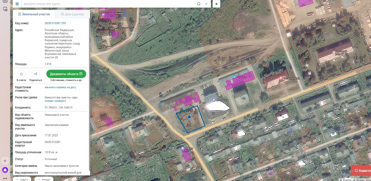 Земельный участок, из земель населенных пунктов, с кадастровым номером 38:09:010301:299, расположенного по адресу: Российская Федерация, Иркутская область, муниципальный район Киренский, городское поселение Киренское, город Киренск, микрорайон Мельничный, улица Воронинская, земельный участок 20, общей площадью 1018 кв.м., разрешенное использование: многоквартирный жилой дом