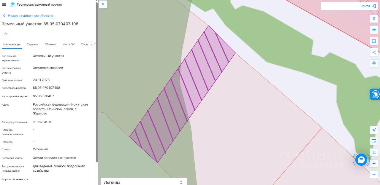 Земельный участок с кадастровым номером 85:05:070407:198, расположенный по адресу: Российская Федерация, Иркутская область, Осинский район, п. Жданово, площадью - 10182,00 кв.м., Разрешенное использование - для ведения личного подсобного хозяйства.