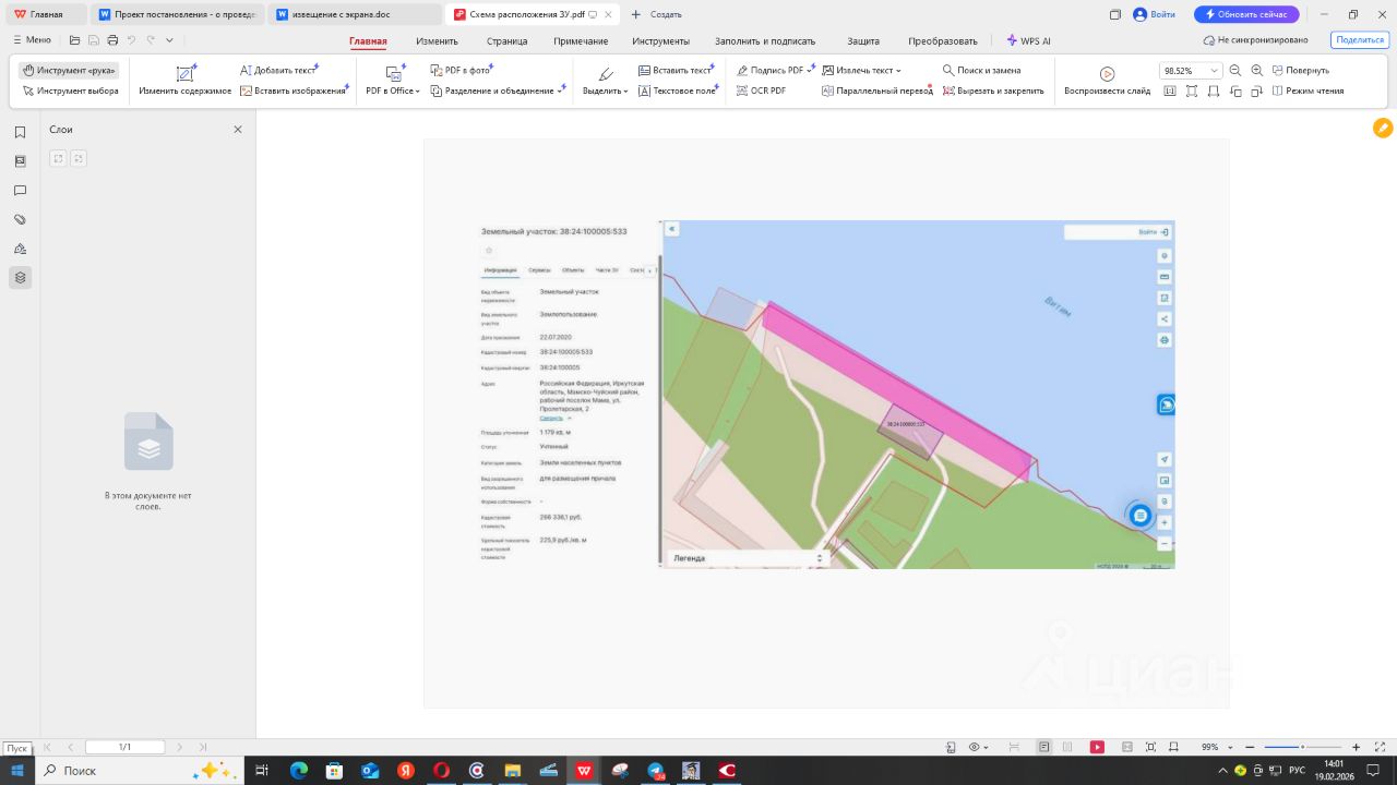 ЛОТ 1 Земельный участок: Российская Федерация, Иркутская область, муниципальный район Мамско-Чуйский, городское поселение Мамское, рабочий поселок Мама, улица Пролетарская, земельный участок 2; Общая площадь: 1179 кв.м.; Кадастровый номер: 38:24:100005:533; Категория земель: земли населенных пунктов; Вид разрешенного использования земельного участка: для размещения причала. Территориальная зона: коммунально-складская зона (ПЗ-2) . Срок аренды земельного участка: 5 лет