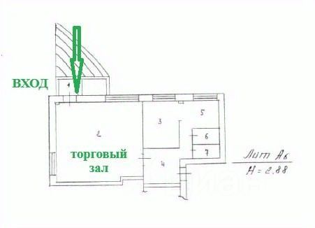 Торговый зал 40 кв.м., два кабинета, два санузла, коридор.
