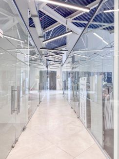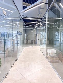 Большое и светлое помещение со стеклянными дверьми.