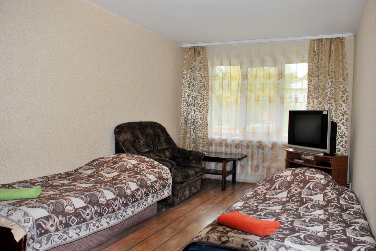 Мебель, техника: плательный шкаф, две кровати, мини-диван, журнальный стол, тумба под телевизор, кабельное телевидение - 200+ каналов, интернет WiFi, кухонный гарнитур, обеденный стол, стулья, посуда вплоть до бокалов.