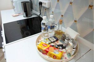 Комплемент от компании: чай, кофе, печенье, бутилированная вода, сахар, соль, перец, растительное масло.