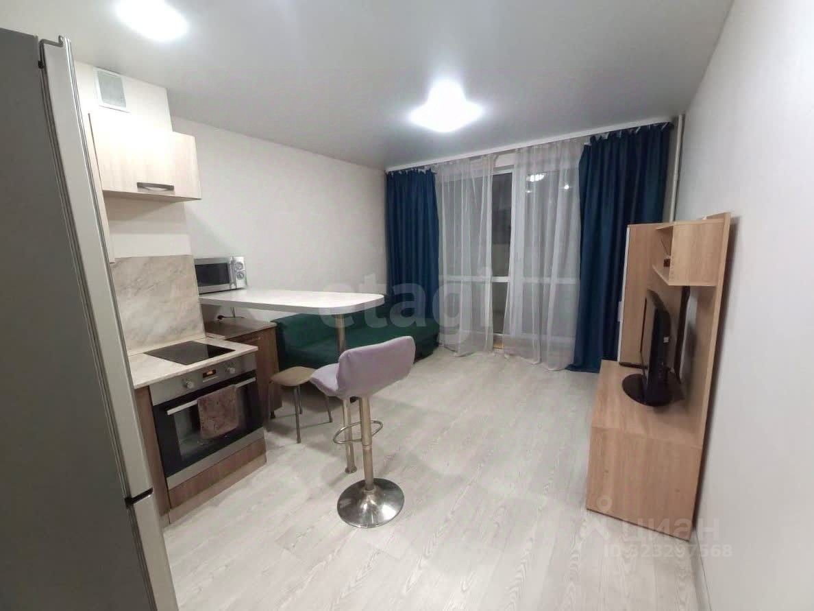 Сдается в аренду уютная квартира-студия на 13-м этаже 15-ти этажного монолитного дома, преимуществом квартиры является просторный балкон с панорамным видом на город, что создает ощущение простора и добавляет значительное дополнительное пространство.