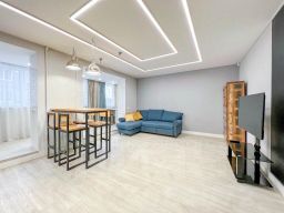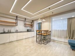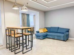 Квартира сделана по дизайн-проекту, преимущественно с использованием синих и белых тонов, интересное решение - натуральное дерево с "оригинальным" рисунком. Сморится очень необычно.