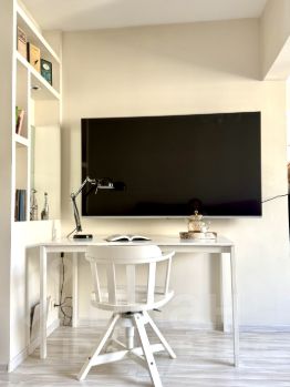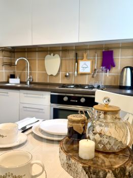 Холодильник, стиральная машина, бойлер( на случай отключения горячей воды) чайник, микроволновка и посуда, шкаф для одежды, телевизор, бесплатный Wi-Fi.