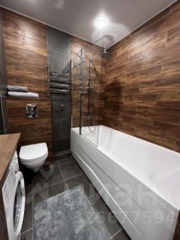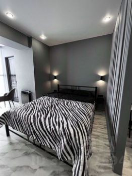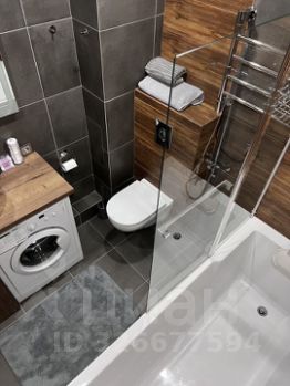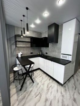 Кухня оборудована холодильником, микроволновой печью и имеет стильный барный стол. Ванная комната совмещенная, выполнена в темных тонах с элементами дерева, оснащена ванной и стиральной машиной. Ванна очень большая -190*90.