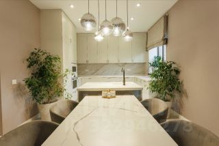 На первом этаже дома просторная кухня-столовая. Всё укомплектовано качественной техникой (духовка, чайник, микроволновка, большая посудомойка, варочная панель, кофеварка, очень много мест для хранения). Кухня продумана до мелочей. Имеется остров с раковиной и с фильтром для питьевой воды. Шикарный гранитный стол! стоит диван для просмотра фильмов. Из данного помещения есть выход на большую террасу! летом просто кайф!