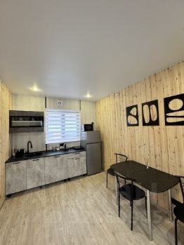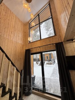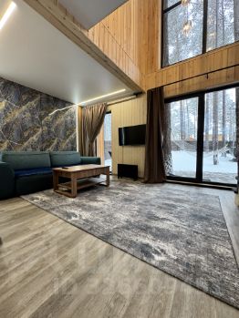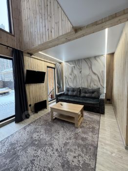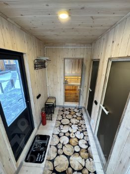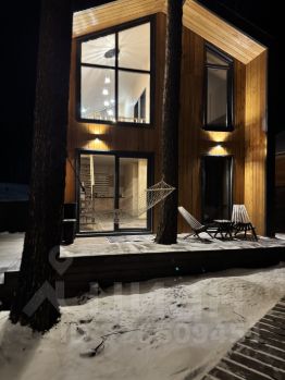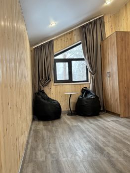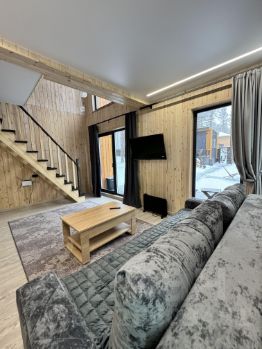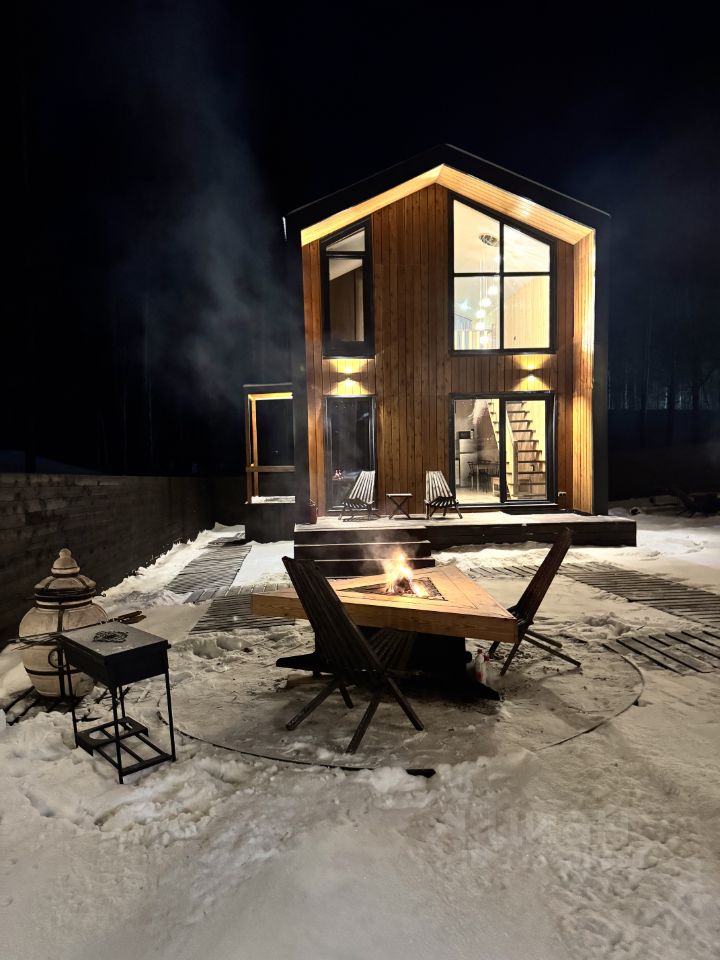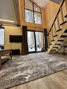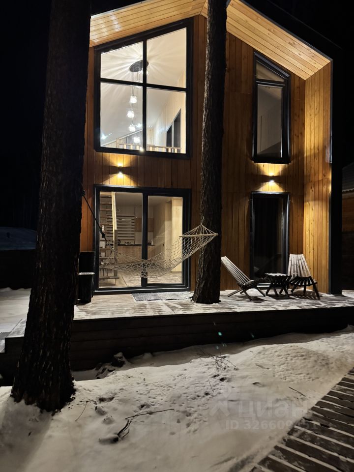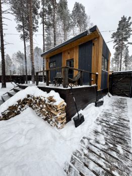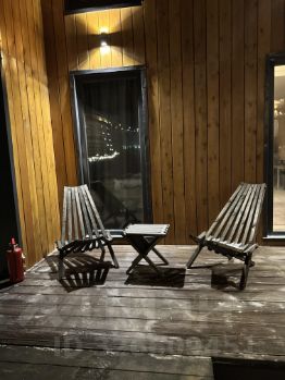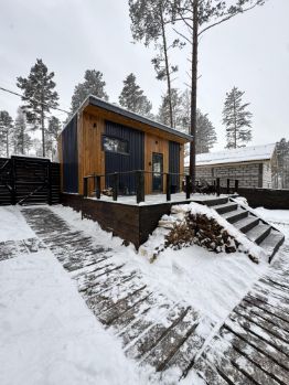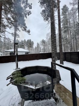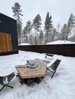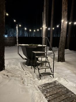На участке два барнхауса по 73 кВ , 2 этажа , в каждом доме по 2 спальни , на первом этаже диван , рассчитан на 2 человека итого в каждый дом может разместиться по шесть человек . Так же на участке есть баня на дровах сибирский чан . На участке сосны и два мангальных стола .
