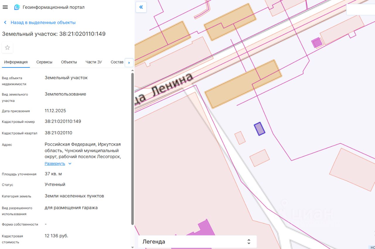 Местоположение земельного участка: Российская Федерация, Иркутская область, Чунский муниципальный округ, рабочий поселок Лесогорск, улица Ленина, земельный участок 8/6. Площадь земельного участка: 37 кв. м. Кадастровый номер земельного участка: 38:21:020110:149. Категория земель: земли населенных пунктов. Разрешенное использование земельного участка: для размещения гаража.