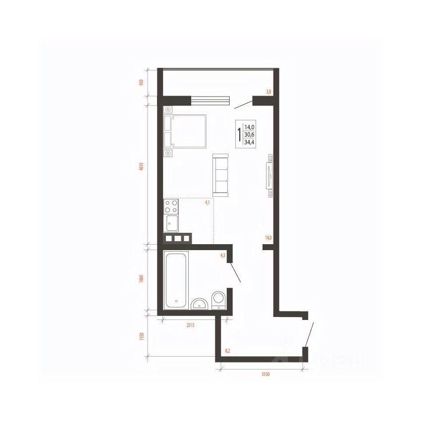 Общая площадь34,4 м²