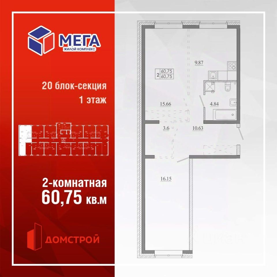 Продаётся 2-комнатная квартира в строящемся доме (Дом 5 (Блок-секция 20)), срок сдачи: IV-кв. 2026, общей площадью 60.75 кв.м., на 1 этаже. Новый жилой комплекс "Мега" от застройщика "ФСК Домстрой" расположен по адресу: Россия, Иркутск, переулок Археолога Михаила Герасимова.