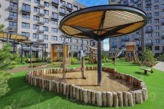 Прекрасный вид: большие панорамные окна наполняют пространство светом и открывают прекрасный вид на благоустроенную приватную территорию квартала.