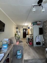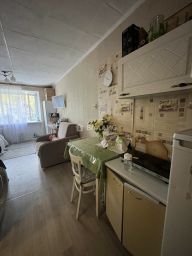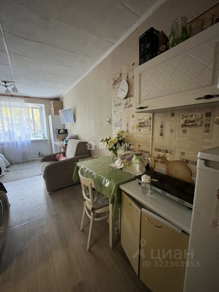 Комната расположена на третьем этаже пятиэтажного кирпичного дома. Здесь уже сделан косметический ремонт, так что можно сразу заезжать и жить. Общая площадь квартиры — 18,4 кв. м, из них жилая площадь — 15 кв. м, площадь кухни — 3 кв. м. Окна выходят на улицу.