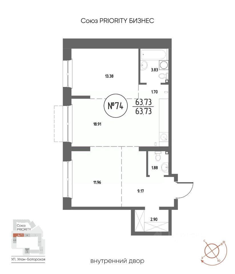 Продаётся 2-комнатная квартира в строящемся доме (Дом 4), срок сдачи: III-кв. 2029, общей площадью 63.73 кв.м., на 2 этаже. Мы начали с эталона - жилого комплекса Союз Priority, лучшего в России. А теперь представляем его логичное и яркое продолжение Союз Priority MAX.