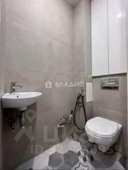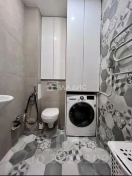 Раковина для рук, подвесной унитаз с гигиеническим душем, вместительные шкафчики для бытовых принадлежностей, электрический полотенцесушитель. Отделка комбинированная: крупноформатный керамогранит + фигурная плитка.