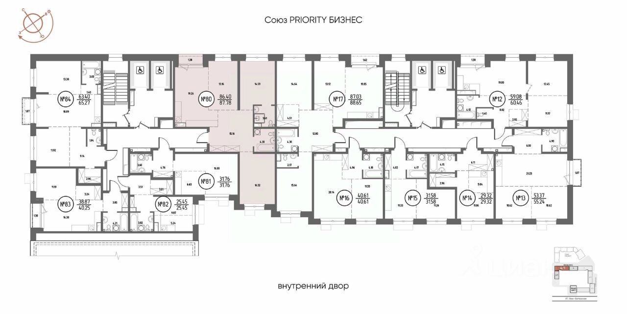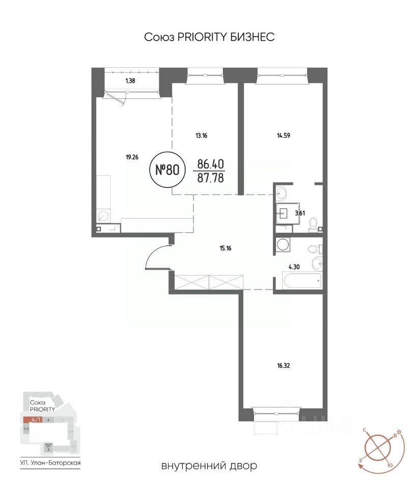 Продаётся 3-комнатная квартира в строящемся доме (Дом 4), срок сдачи: III-кв. 2029, общей площадью 87.78 кв.м., на 4 этаже. Мы начали с эталона - жилого комплекса Союз Priority, лучшего в России. А теперь представляем его логичное и яркое продолжение Союз Priority MAX.