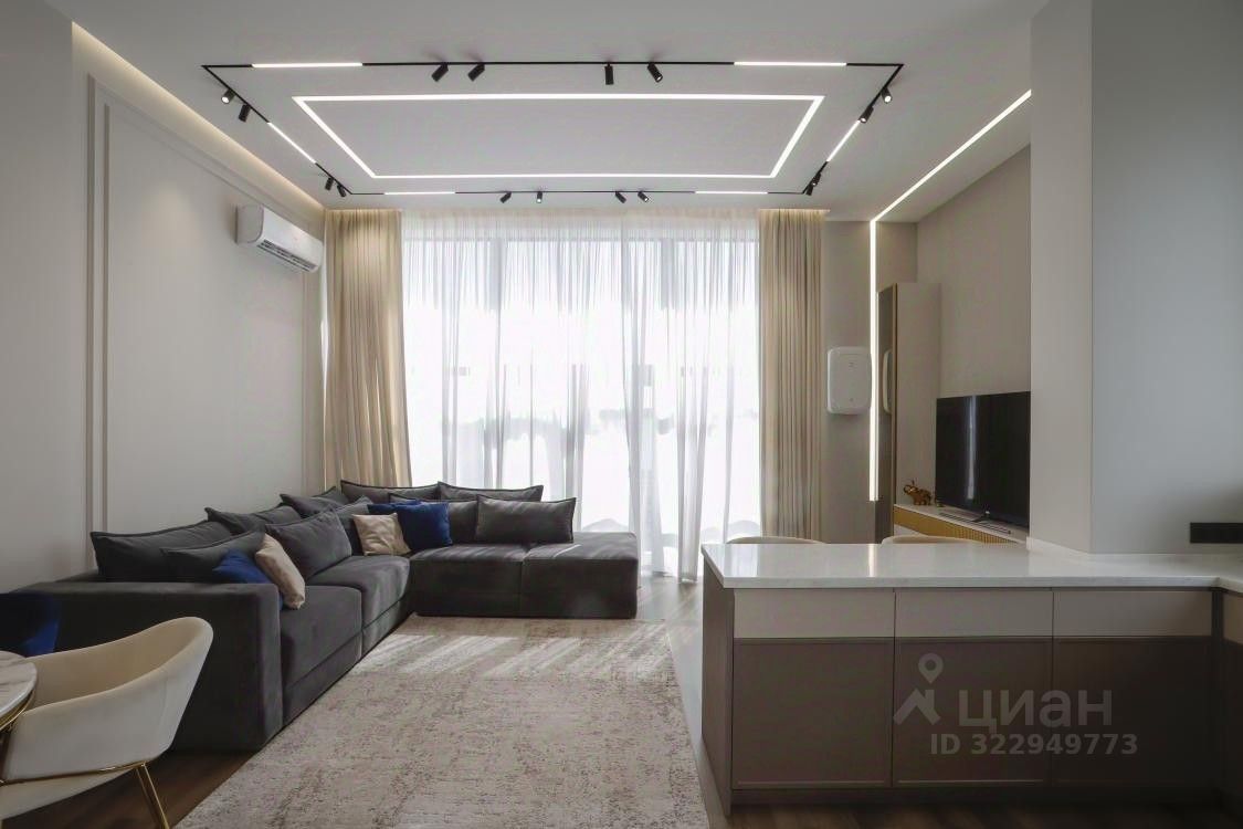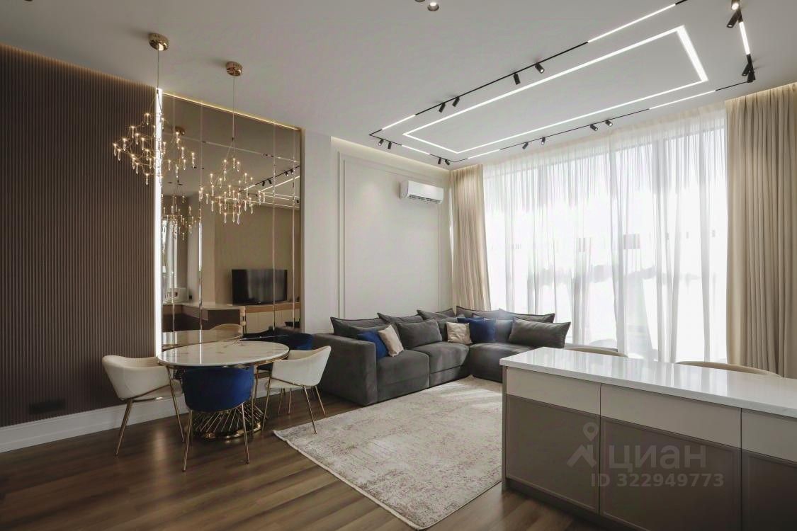 Большие понорамные окна, много естественного света, очень хороший ремонт, дорогая мебель, много систем храенния.