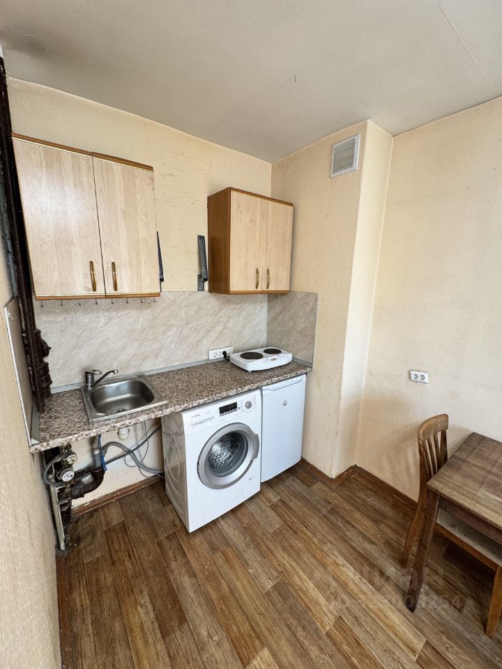Кухня оборудована всем необходимым: есть мойка, варочная панель, шкафчики для хранения, стиральная машина и холодильник.