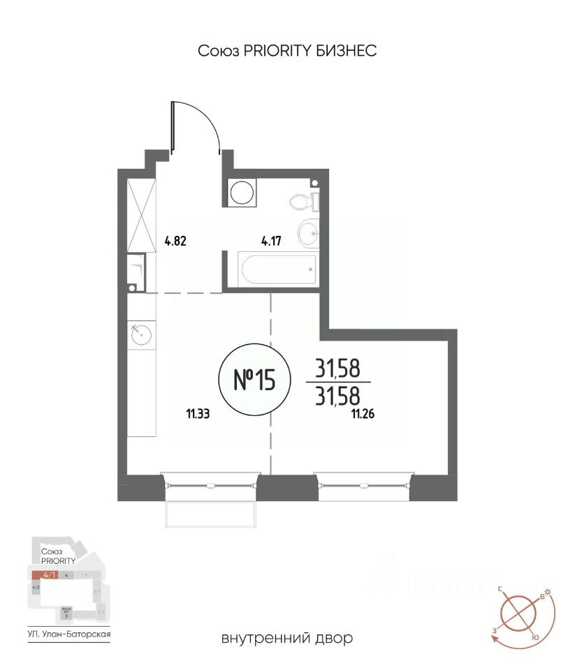 Продаётся 1-комнатная квартира в строящемся доме (Дом 4), срок сдачи: III-кв. 2029, общей площадью 31.58 кв.м., на 4 этаже. Мы начали с эталона - жилого комплекса Союз Priority, лучшего в России. А теперь представляем его логичное и яркое продолжение Союз Priority MAX.
