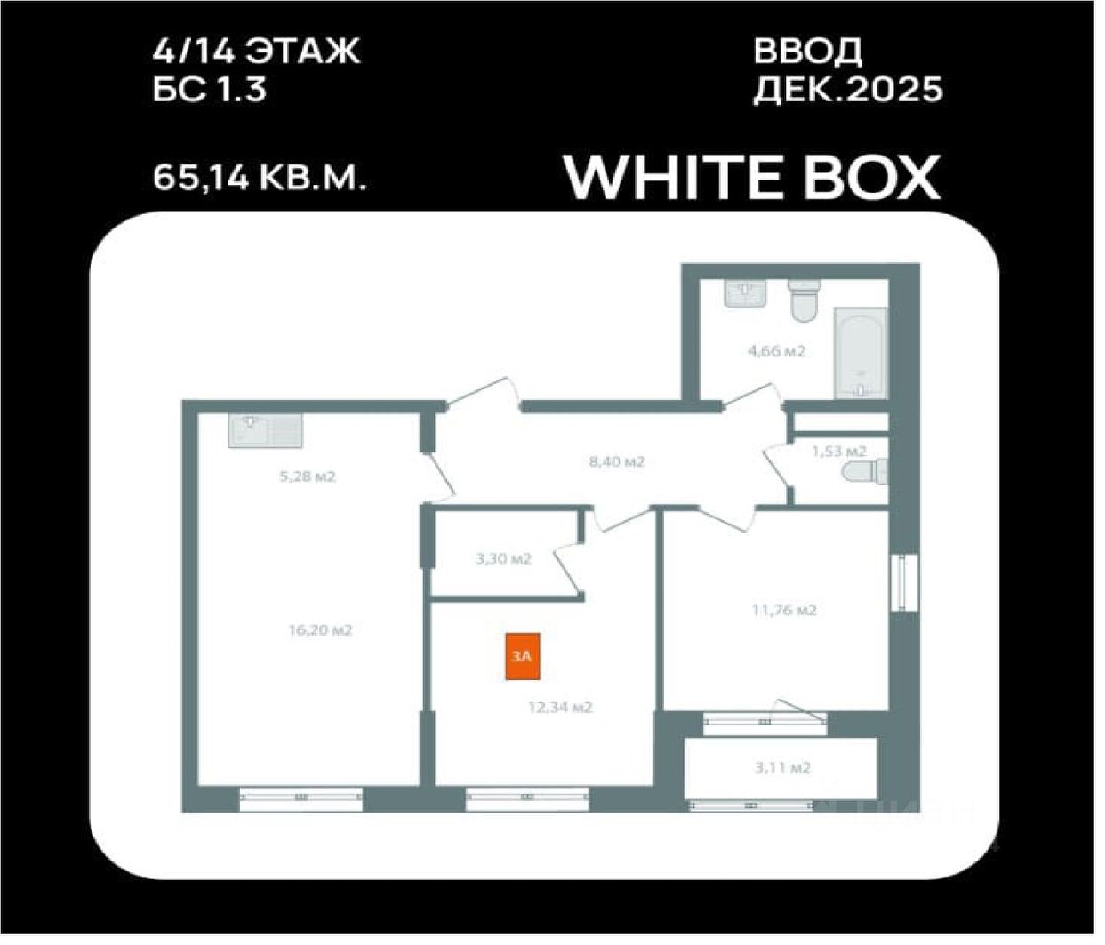 3 комнатная квартира, общая площадь 65,14 кв. м.