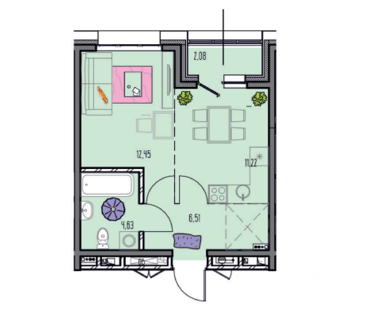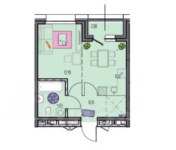 1 комнатная квартира, общая площадь 36,89 кв. м.