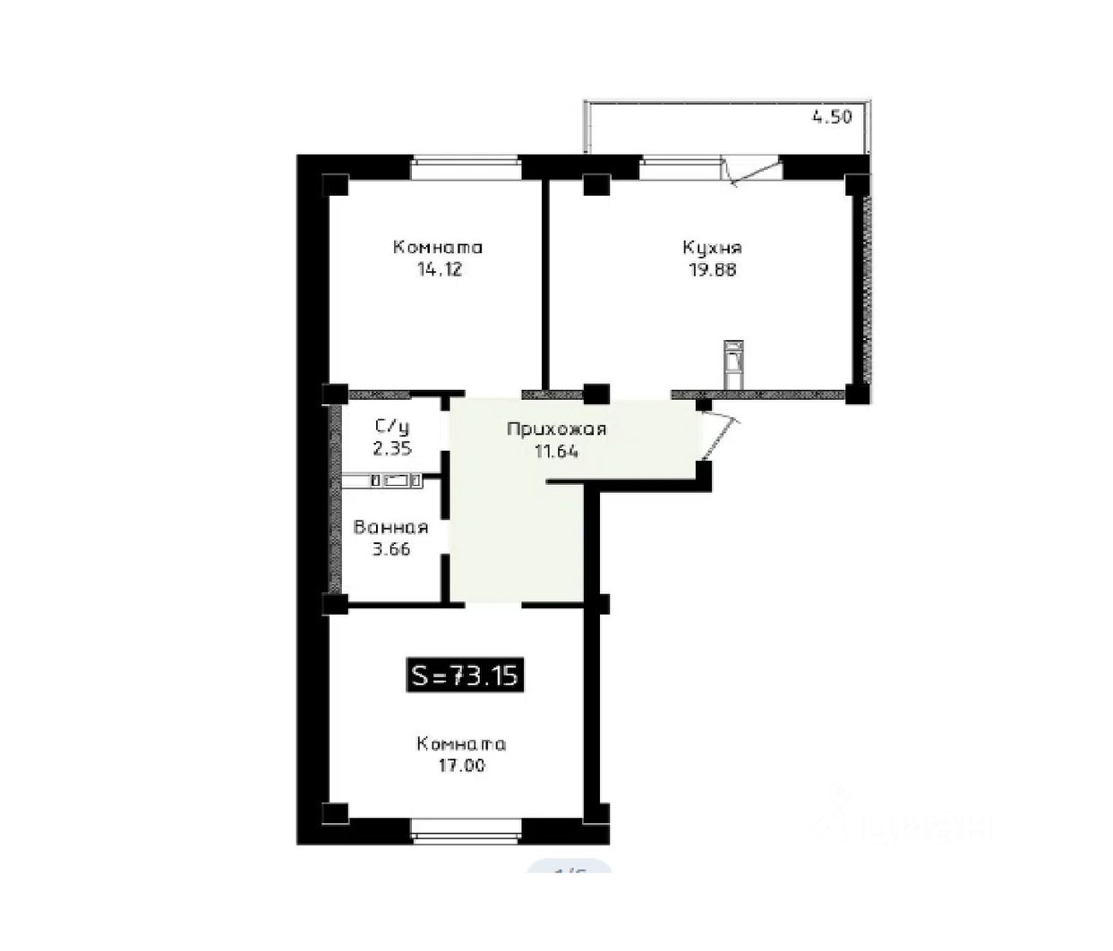 3 комнатная квартира, общая площадь 73,2 кв. м.