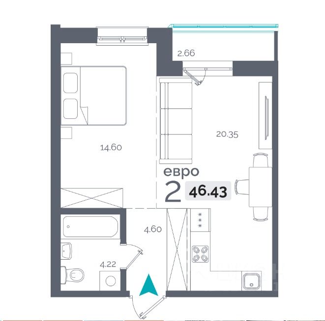 Евро 2 комнатная квартира, общая площадь 46,4 кв. м.