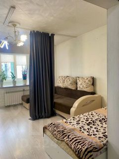 Обратите внимание, что жилая комната зонирована шторой, интересное решение, если отделить спальное место от гостевой части.