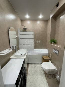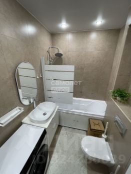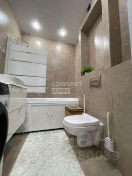 Санузел: Совмещённый санузел, отделанный керамогранитом в современном стиле.