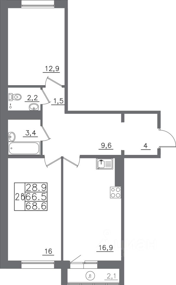 Общая площадь68,6 м²