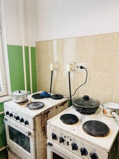 Кухня общая, оснащена двумя электрическими плитами, раковиной, есть отдельный кухонный шкаф для хранения продуктов и посуды.Санузел раздельный.