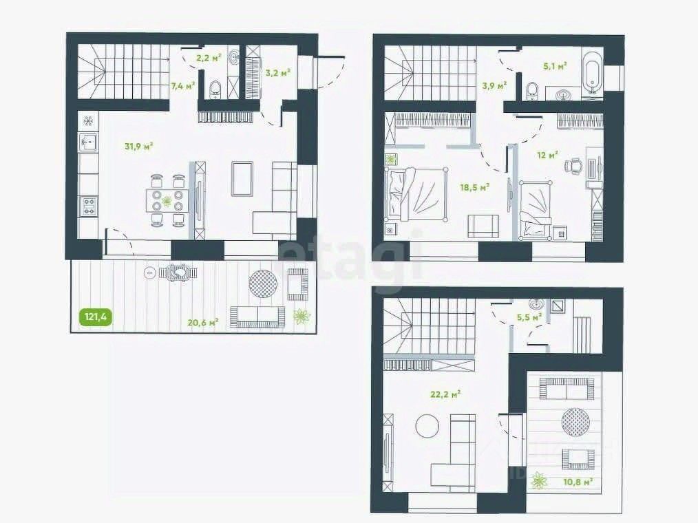 Комфортная планировка, все продумано до мелочей. На первом этаже: просторная гостиная с выходом на балкон, кухня-столовая, санузел и гардеробная. На втором этаже детская комната и две спальни, второй санузел. Третий этаж обустроен под рабочий кабинет.
