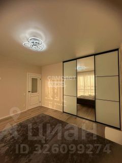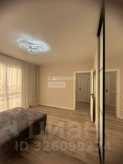 Спальня: уютная, с мягкой серой кроватью, встроенный шкаф-купе с зеркалами, нежные обои, шторы, современная люстра.